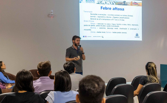 Na palestra sobre as ações do plano estadual de retirada da vacinação contra a febre aftosa, João Eduardo mostrou aos estudantes o que é a doença, seus sintomas, impactos e apresentou as medidas que estão sendo realizadas pela Adapec em preparação para a retirada da vacinação, além das ações que posteriormente deverão ser implementadas, como: aumentar as vigilâncias ativas nas propriedades, reforçar o controle de trânsito de animais e produtos, realizar inquéritos soroepidemiológicos sobre circulação viral, atendimento nas suspeitas de síndromes vesiculares por meio de exames clínicos, manutenção da declaração do rebanho duas vezes ao ano, intensificar as fiscalizações em eventos pecuários e estabelecimentos de abate, entre outros.