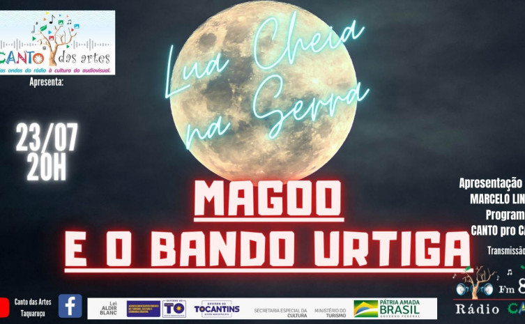 A Associação Amigos da Cultura e do Meio Ambiente – Taquaruçu - Canto das Artes, com apoio do Governo do Tocantins, por meio da Agência Desenvolvimento do Turismo, Cultura e Economia Criativa (Adetuc), realizará nesta sexta-feira, 23, a partir das 20 horas, mais uma apresentação musical da série de eventos Lua Cheia na Serra. Desta vez, com a participação especial de Magoo e o bando Urtiga.