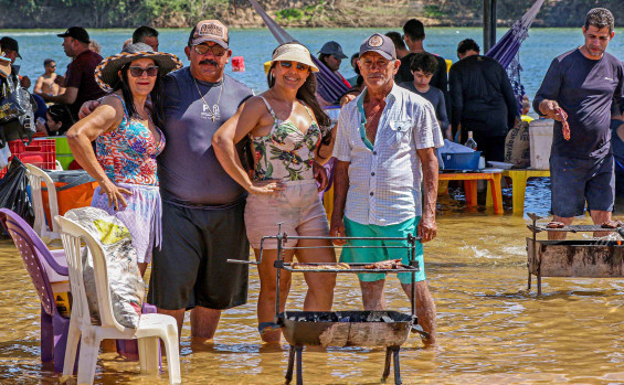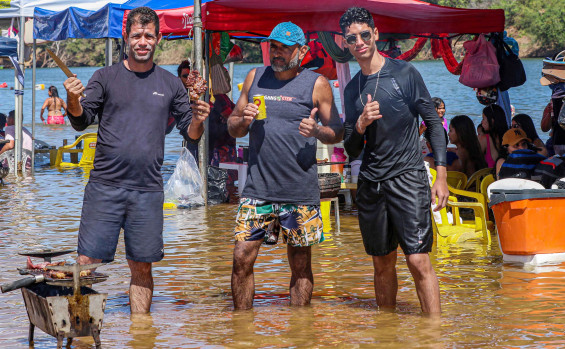 Dentro da água mesmo, sob o sol do meio dia, a cearense Joelma de Castro, de Fortaleza- CE, ajudava o pai a assar o churrasco de carneiro. Em sua primeira vez na região, ela conta que se sentiu surpresa com a praia e com a segurança. "É uma impressão maravilhosa e a praia é linda. A gente se sente bem com a presença dos bombeiros, se sente segura. É uma experiência maravilhosa", afirmou.