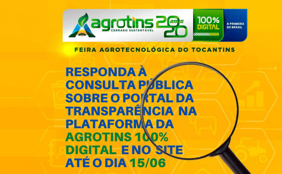 A consulta pública sobre o Portal da Transparência, que iniciou na Feira Agrotecnológica do Tocantins - Agrotins 2020 100% Digital, continua até o dia 15 de junho e pode ser acessada através do link https://forms.gle/gZvyJbdDeCeZLY166. Na pesquisa, o cidadão pode avaliar itens como linguagem, clareza, facilidade de localização e a disponibilidade das informações no Portal. Também pode indicar quais aspectos considera positivos e/ou negativos e trazer sugestões de aprimoramento.