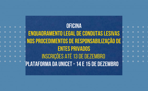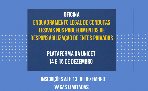 A oficina, Enquadramento Legal de Condutas Lesivas nos Procedimentos de Responsabilização de Entes Privados, foi transferida para os dias 14 e 15 de dezembro. Com isso, o prazo de inscrições foi ampliado para até, o próximo dia 13. Podem se inscrever servidores e servidoras do Executivo e de órgãos parceiros.