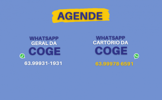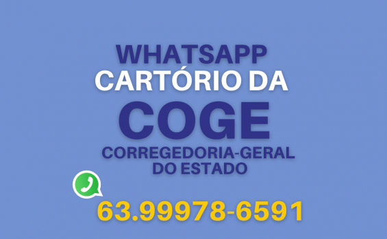 A Corregedoria-Geral do Estado (Coge) conta com dois canais de atendimento pelo WhatsApp, sendo o (63) 99931-1931 o contato geral com o setor pelo aplicativo e o (63) 99978-6591 para as demandas exclusivas do cartório da Coge.