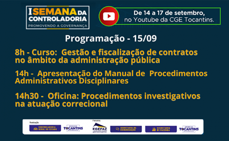 A 1ª Semana da Controladoria prossegue até a próxima sexta-feira,17, e é uma realização do Governo do Tocantins, por meio da CGE-TO. Todas as atividades estão sendo transmitidas ao vivo pelo canal da CGE Tocantins no YouTube.