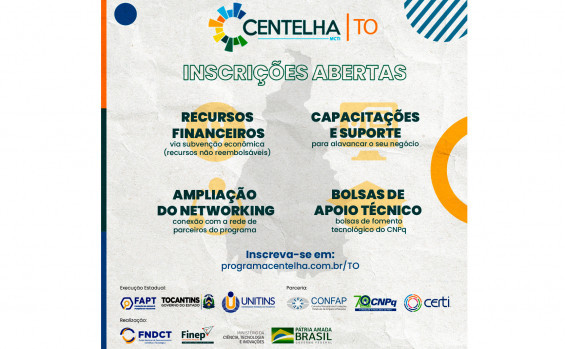 Executado no Tocantins pela Fundação de Amparo à Pesquisa (FAPT), o Programa Centelha visa estimular a criação de empreendimentos inovadores, a partir da geração de novas ideias, e disseminar a cultura do empreendedorismo inovador.