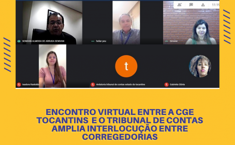 A troca de experiências relacionadas à correição de pessoal pautou o encontro virtual entre a Controladoria-Geral do Estado do Tocantins (CGE-TO) e o Tribunal de Contas do Estado (TCE/TO), nesta terça-feira, 1º de junho. O secretário-chefe da CGE-TO, Senivan Almeida de Arruda, e a corregedora-geral do Estado, Simone Pereira Brito, participaram da reunião.