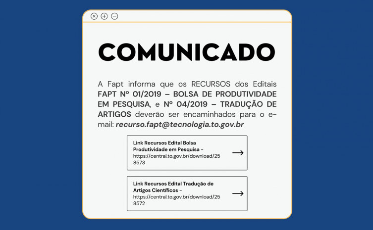 Para outras informações, acessar https://www.to.gov.br/fapt/editais/31uugl1y7as4.