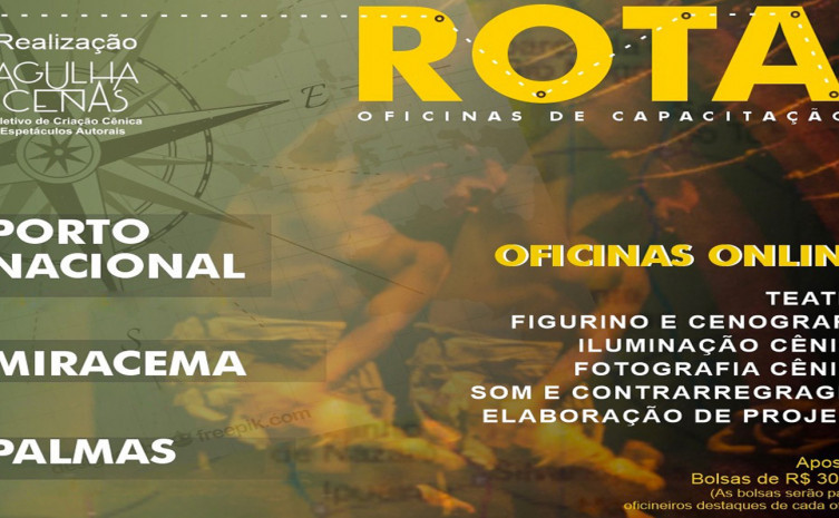 Com apoio do Governo do Tocantins, por meio da da Agência de Desenvolvimento do Turismo, Cultura e Economia Criativa (Adetuc), estão sendo realizadas desde do dia 3 de junho oficinas de capacitação voltadas à área de artes cênicas. A iniciativa faz parte do projeto Rota – Oficinas de capacitações, da Companhia Coletivo Agulha Cenas. As oficinas já foram realizadas, no formato on-line, para as cidades de Porto Nacional e Miracema. A próxima etapa ocorre neste sábado, 10, das 14 às 17 horas, destinada aos participantes de Palmas.