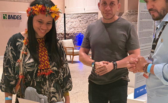 Narubia Werreria conversou com os participantes do painel, entre eles, o artista Gilberto Gil; a conselheira da CI-Brasil, ministra dos Povos Indígenas, Sônia Guajajara; o cacique Raoni, liderança Kayapó; e a CEO interina da Conservation Internacional, Daniela Raik, que desenvolveram uma roda de conversa sob mediação do vice-presidente da CI-Brasil, Maurício Bianco.