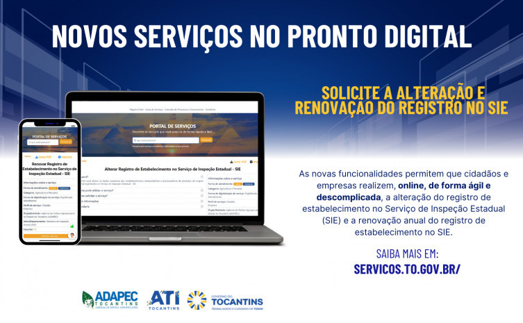 A Agência de Tecnologia da Informação (ATI), em parceria com a Agência de Defesa Agropecuária do Tocantins (Adapec), acaba de disponibilizar dois novos serviços digitais no portal Pronto Tocantins. As novas funcionalidades permitem que cidadãos e empresas realizem, de forma ágil e descomplicada, a alteração do registro de estabelecimento no Serviço de Inspeção Estadual (SIE) e a renovação anual do registro de estabelecimento no SIE. Os serviços podem ser solicitados de forma presencial ou digital, com a vantagem de que, no ambiente on-line, o usuário consegue acompanhar todo o processo de forma transparente e sem filas.