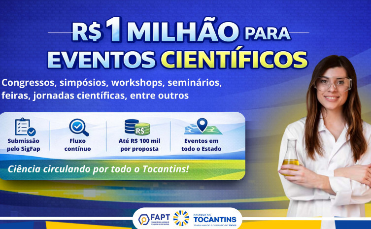 O Governo do Tocantins, por meio da Fundação de Amparo à Pesquisa do Tocantins (Fapt), publicou o Edital nº 01/2026, que vai apoiar financeiramente a realização de eventos técnico-científicos no estado ao longo de todo o ano de 2026. A chamada, em fluxo contínuo, destina R$ 1 milhão para viabilizar congressos, simpósios, workshops, seminários, feiras, jornadas científicas e outras iniciativas voltadas à divulgação e ao fortalecimento da Ciência, Tecnologia e Inovação (CT&I).