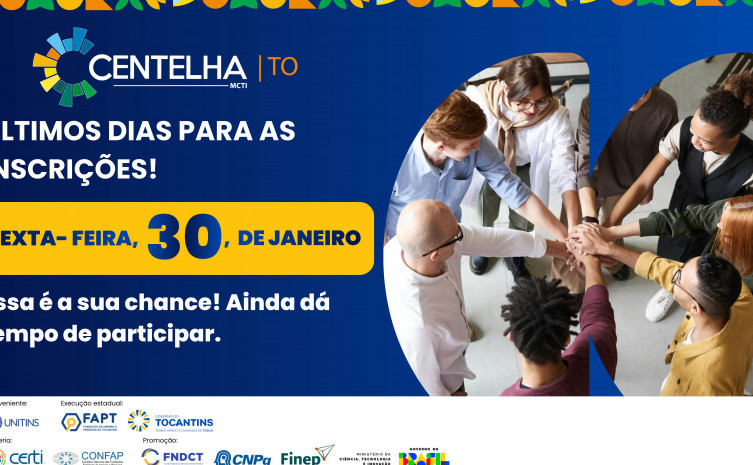 O período para inscrições no programa Centelha 3 Tocantins encerra nesta sexta-feira, 30. As propostas devem ser enviadas até as 18 horas, horário de Brasília, exclusivamente de forma eletrônica, por meio do site Centelha Tocantins.