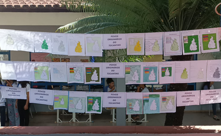 Para fixar o conteúdo, após as aulas que utilizaram materiais da secretaria, duas turmas fizeram uma exposição no pátio para os demais estudantes verem sobre povos originários do Tocantins. Inspirados em materiais gráficos produzidos pela Sepot, desenharam e pintaram mapas que informam onde cada etnia indígena está localizada no estado. “Trabalho aqui há 15 anos e sempre tivemos muita dificuldade para encontrar material que falasse sobre os povos indígenas do nosso estado. Encontramos informações dispersas, mas nada com muita eficiência didática. Passando pela página dos Povos Originários e Tradicionais no Instagram, vi uma postagem sobre os povos originários e montei um slide com essa temática”, acrescentou.
