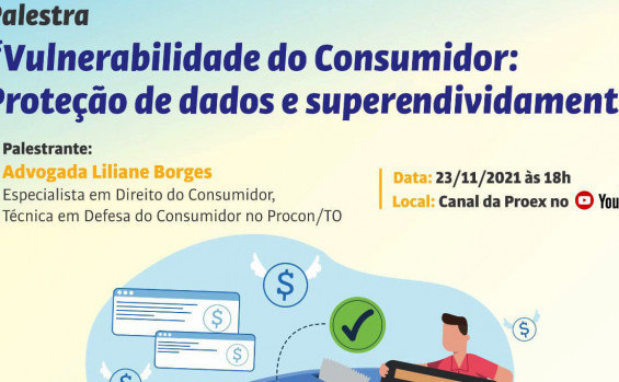 Nesta terça-feira, 23, o Procon Tocantins, em parceria com a Universidade Estadual do Tocantins (Unitins) câmpus de Dianópolis, realiza palestra sobre Vulnerabilidade do Consumidor: Proteção de Dados e Superindividamento. A palestra que ocorre às 18 horas será ministrada pela técnica em Defesa do Consumidor do Procon Tocantins, a advogada e especialista em Direito do Consumidor, Liliane Borges.