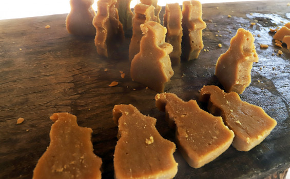 Em seguida, quando está grosso, o produto é colocado em uma grade de madeira, até que cada compartimento seja preenchido. Após 20 a 25 minutos, quando já endureceu, as divisões que compõem a grade são removidas para a matéria-prima esfriar. “Na hora que ela esfriou, a gente tira, coloca numa vasilha para ali e tá no jeito, a rapadura tá pronta”.