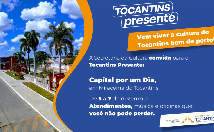 A Secretaria de Estado da Cultura (Secult) levará diversos serviços ao lançamento oficial do programa Tocantins Presente, do Governo do Tocantins, que será realizado em Miracema do Tocantins, de sexta-feira, 5, a domingo, 7, em frente à Câmara Municipal, no bairro Dona Filomena. Integrando a ação, a Secult participará com uma programação cultural especial preparada para o público, reforçando seu papel dentro do conjunto de atividades da Capital por um Dia e contribuindo para aproximar ainda mais a política cultural da comunidade.