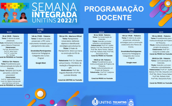 A Universidade Estadual do Tocantins (Unitins) inicia as atividades do semestre letivo 2022/1 nesta terça-feira, 1° de fevereiro, e como já é tradição, realiza a Semana Integrada, com programação especial para toda a comunidade acadêmica. O evento ocorre nesta terça e quarta-feira, 1° e 2, de forma virtual, com transmissões via YouTube e Google Meet, oferecendo uma vasta programação.